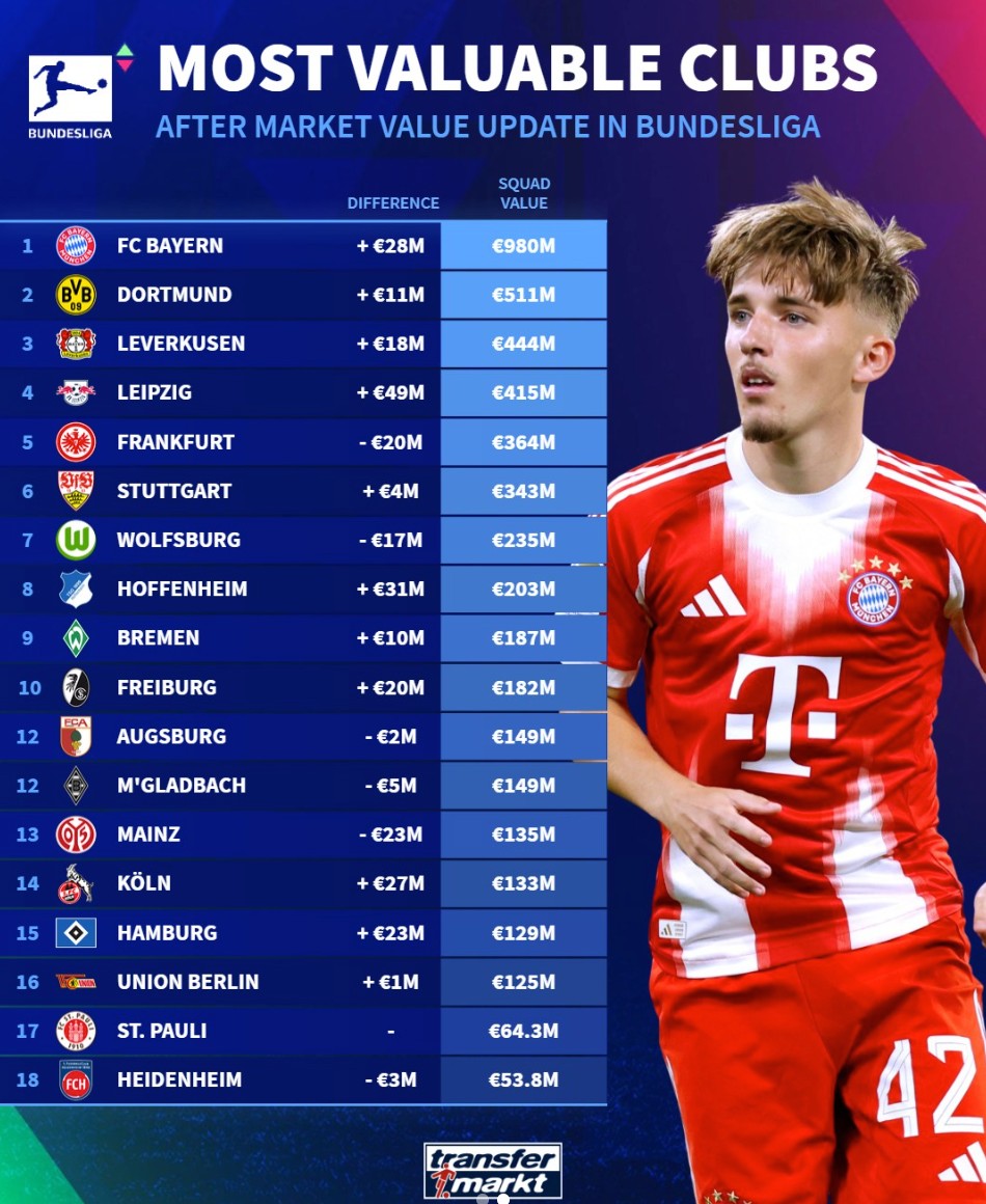 德甲俱樂部身價榜:拜仁9.8億歐斷檔領先,海登海姆5380萬最低